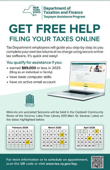 Free tax help will be available at the library on select days, thanks to the NYS Tax Department! Head to www.tax.ny.gov/tap to register! Friday, 3/13 Friday, ...
